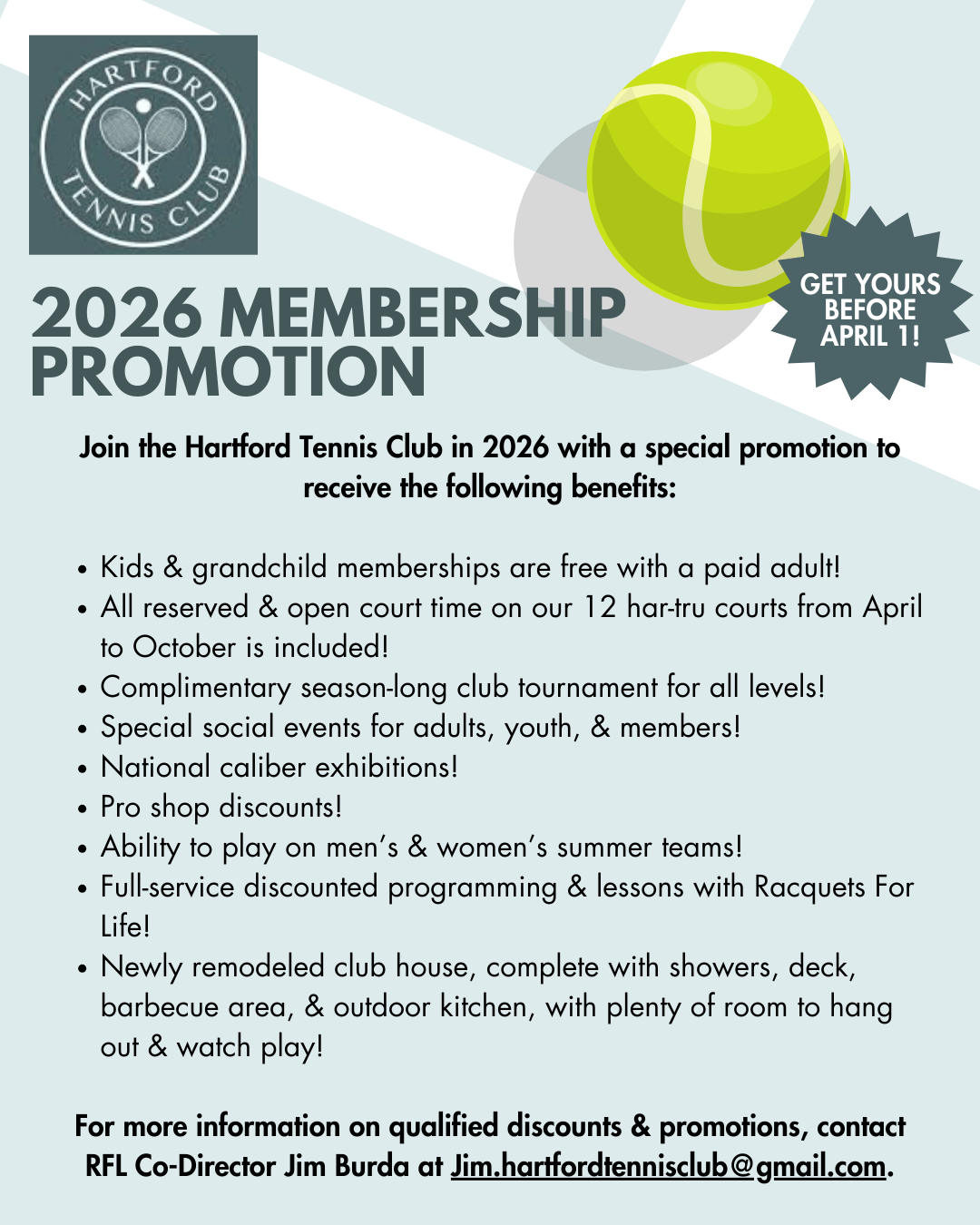 Established in 1937, the Hartford Tennis Club is one of the oldest and largest private outdoor tennis clubs in New England. The Club proudly sets the standard for excellence, catering to players of all ages and skill levels. The Club has 12 professionally maintained Har-Tru tennis courts, a newly renovated clubhouse, and onsite tennis pros. The official season kicks off Memorial Day and ends Labor Day, but courts open in early April and remain open into the late fall (weather permitting).